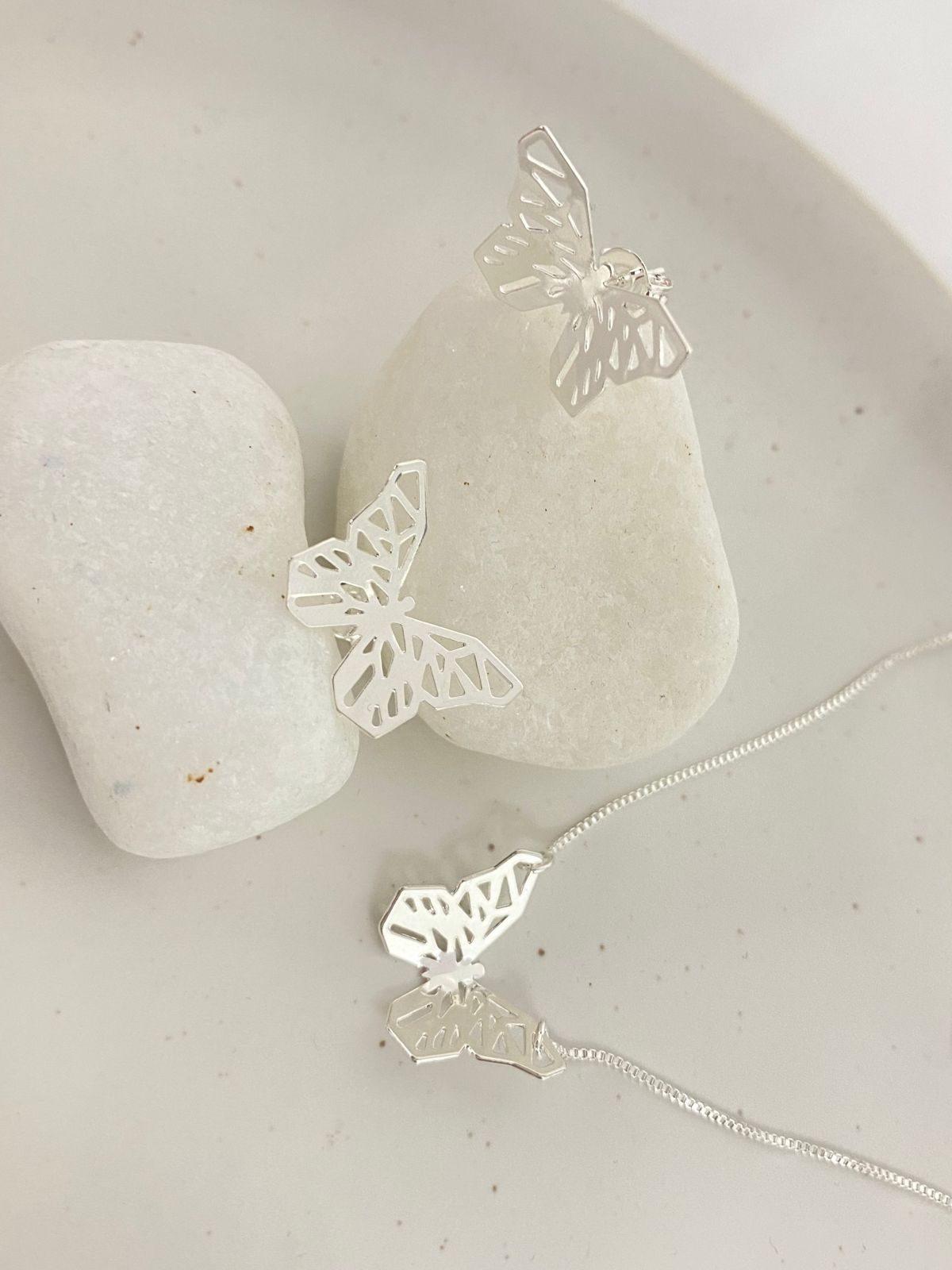 CONJUNTO BRINCO E COLAR 45CM BORBOLETA ORIGAMI VAZADA 20MM